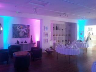 An example of LED uplighting. This client had a teal and pink colour theme which could be matched perfectly to wash the walls and ceiling in soft blue and pink light. Effective, even by day.